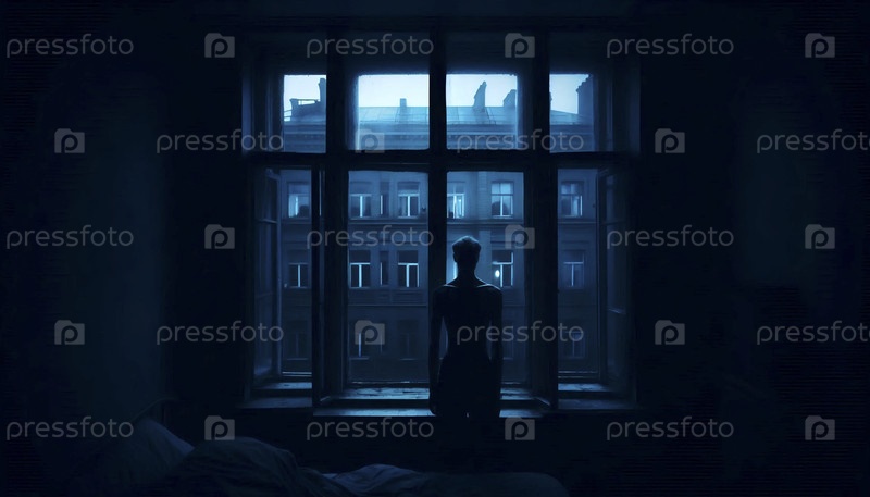 Силуэт в окне на закате, Ai generated image