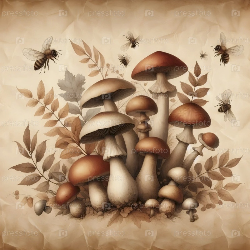 иллюстрация пчел и грибов