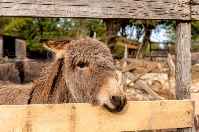 Милые пушистые ослы вытаскивали свои головы из конюшни, домашние сельскохозяйственные животные на открытом воздухе