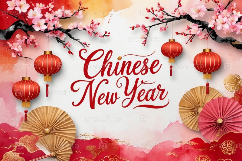 Поздравления с Новым годом, китайские традиционные символы Китайские фонари и вишневые ветви AI Generative