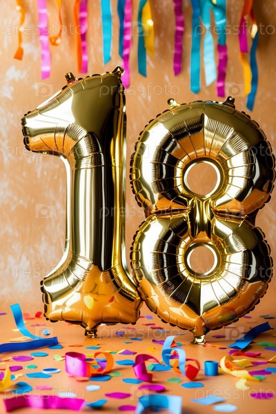 Гелиевый баллон на день рождения в форме числа восемнадцать, фигура золотой буквы 18 на фоне праздничного торжества