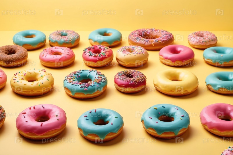 Ярко окрашенные пончики пончик на столе, натюрмортное украшение выпечки закуска десертный десерт AI Generative