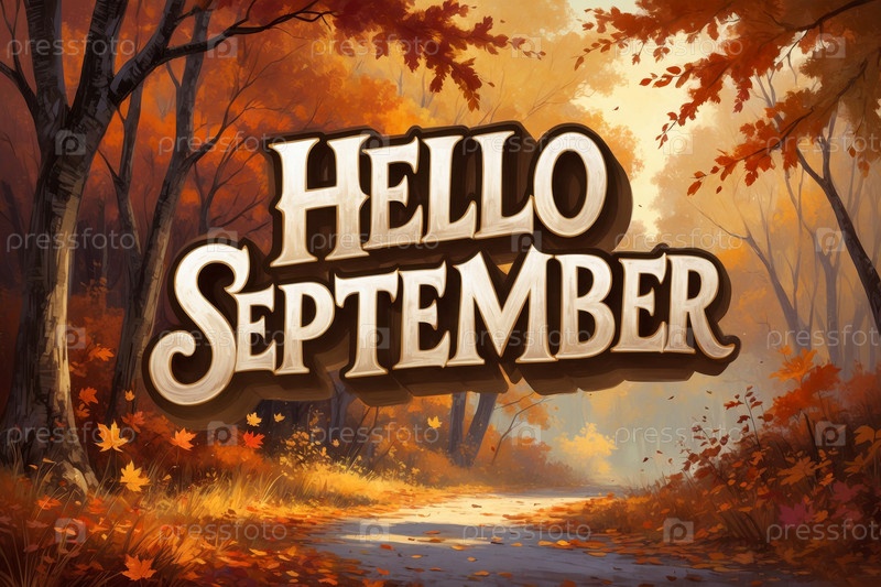 AI Generative Поздравление с надписью Привет, сентябрь осень-осень на фоне желтых и красных листьев листопад