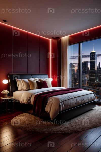 Уютный интерьер Спальня Квартирная комната красный цвет, Комфортный дом Дизайн современного дома AI Generative