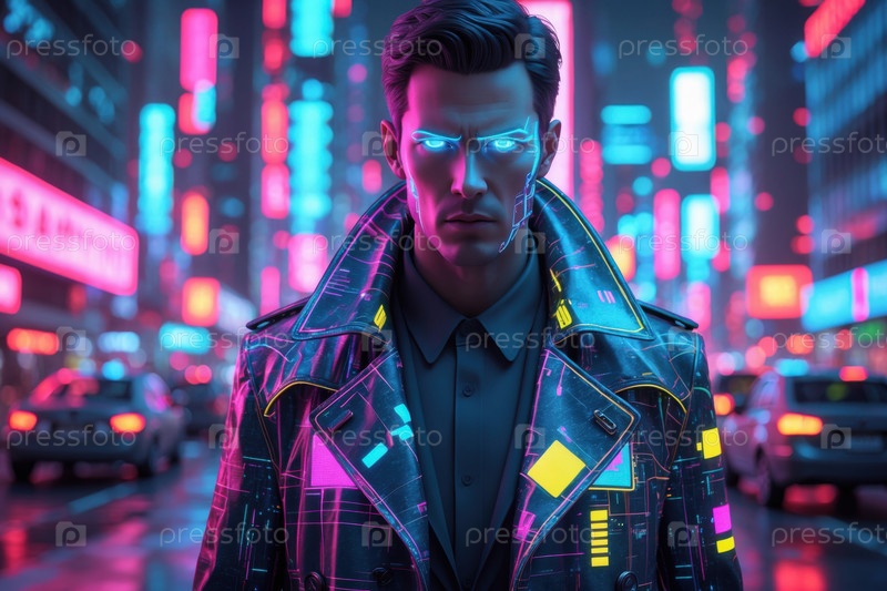Человек-гуманоид в футуристическом неоновом костюме, человек на будущем научном фантастическом завтрашнем фоне AI Generative