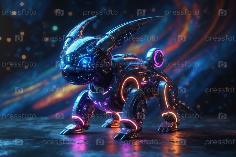 Фантастическое мифологическое животное из сказки, домашняя собака с механическими частями тела