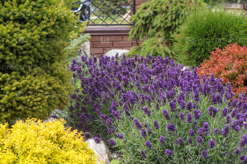 Цветение лаванды сорта Sweet Romance в окружении красного и желтого варбарисов и хвойных низкорослых растений