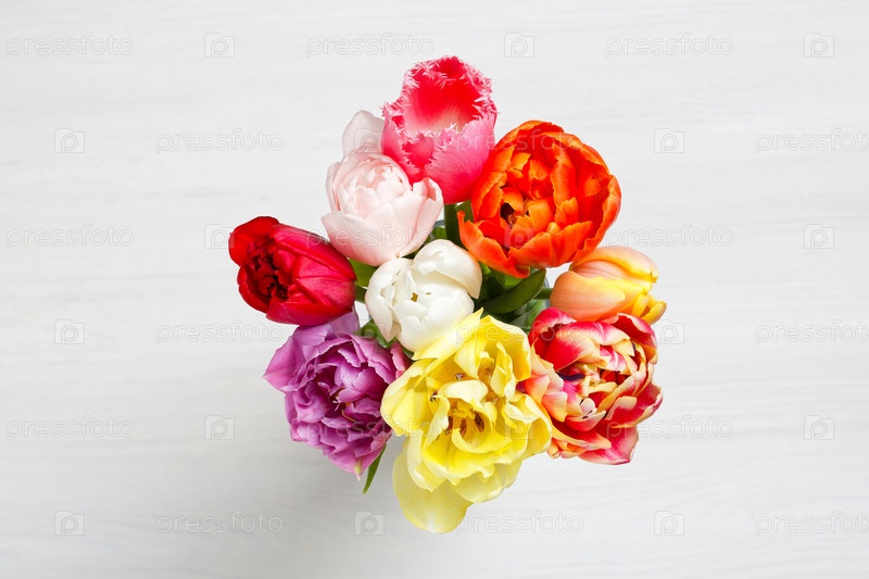 Ближайшее изображение яркого букета тюльпанов с многоцветными цветками на белом деревянном столе