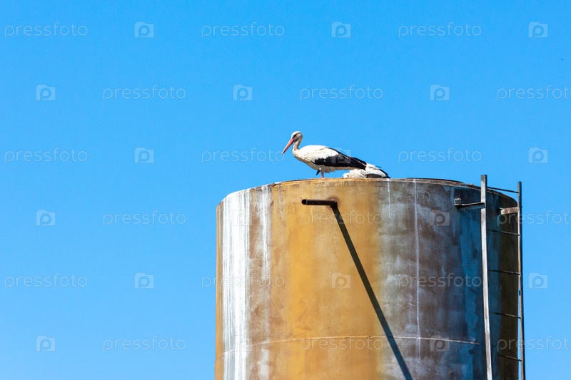 Белые аисты на металлическом ржавом резервуаре на голубом фоне безоблачного неба