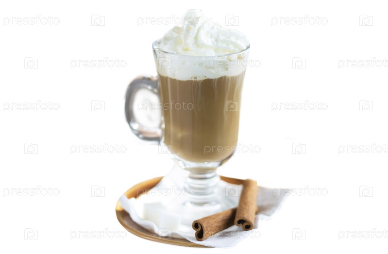 Напиток кофейный с корицей, взбитыми сливками и салфеткой на тарелке. Крупный план на белом фоне