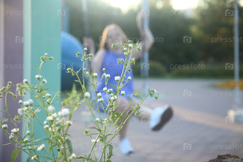 Цветы белые крупным планом и красивая девушка в синем платье на качелях позирует на улице