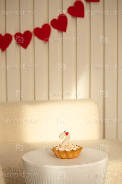 Романтический декор с гирляндой из красных сердец и десертом на столике