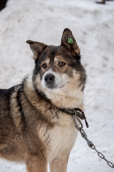 Портрет дворовой собаки на цепи на фоне снега