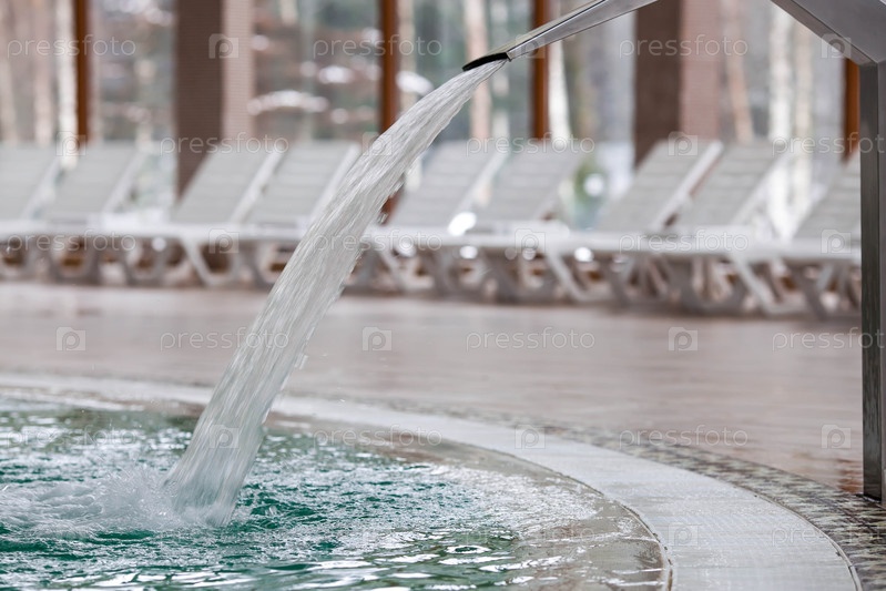 Оборудование в крытом бассейне для массажа спины и шеи перед шезлонгами. Поток воды под высоким давлением. Концепция отдыха, спа-центра и омоложения в курортном отеле. Туризм