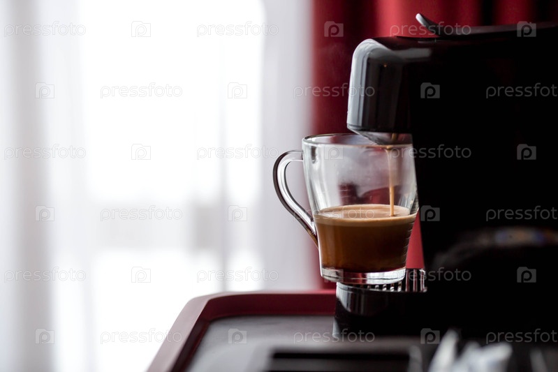 Свежеваренный кофе, выливающийся из кофейного автомата на размытом фоне.Кофеварка наливает кофе в прозрачную стеклянную чашку
