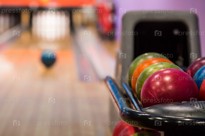 Боулинг-клуб с красочными мячами и булавками.Игры и развлечения