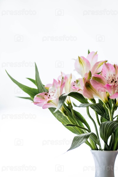 Букет розовых альстроэмерий с зелеными листьями в белой вазе на белом фоне