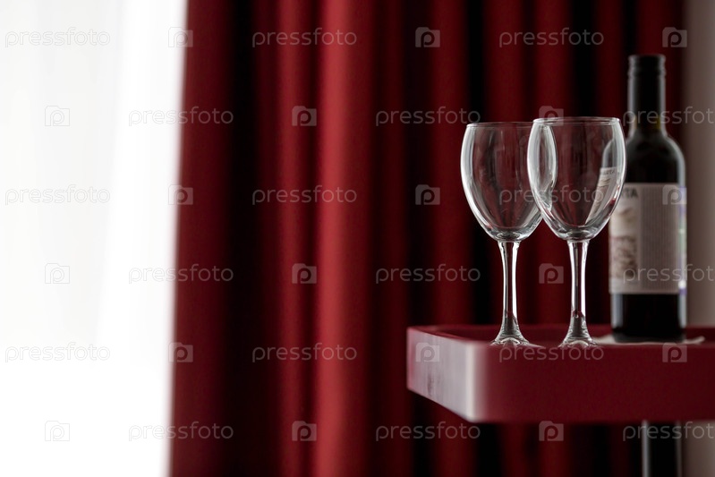 Роскошный, стильный натюрморт.Стеклянные бокалы и бутылка красного вина на бургундском столе.Концепция романтического ужина или вечеринки