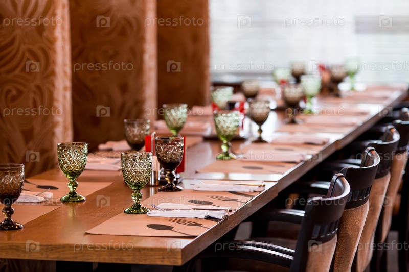Стильная столовая обстановка. Стеклянные очки и приборы на деревянном столе. Стол, установленный в ресторане. Свадебная служба, буфет за обеденным столом. Вечеринка по случаю дня рождения или праздничное мероприятие