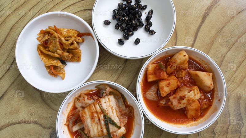 Кимчи, нори и редис традиционная корейская ферментированная еда в маленьких мисках, Южная Корея