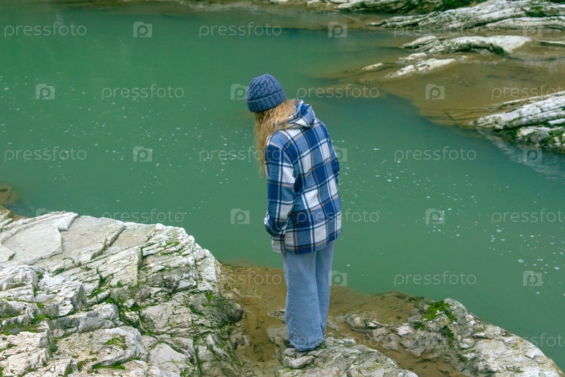 Девочка в квадратном куртке смотрит на реку в природном парке