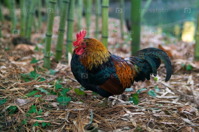 Красочный петух в бамбуковом лесу