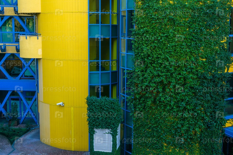 Желто-синее современное здание с зеленым плюшем на фасаде
