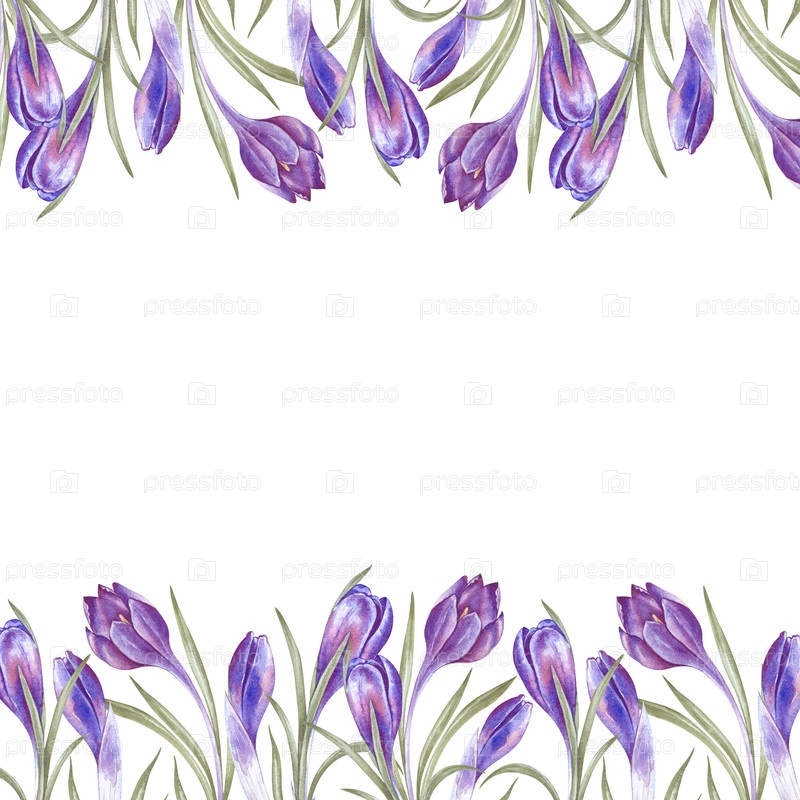 Квадратная рама с фиолетовыми крокусами на изолированном фоне. Акварельная иллюстрация с весенними цветами. Ботанический шаблон с пустым местом для вставки весенних тем и пасхальных праздников, открыток и приглашений