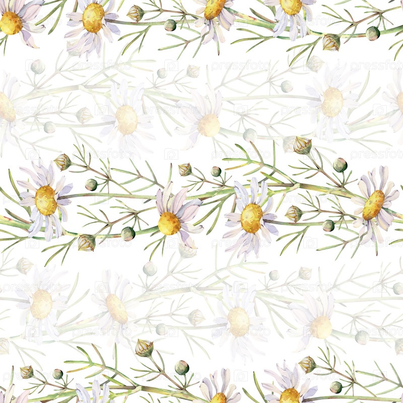 Горизонтальный бесшовный рисунок с букетом ромашек на изолированном фоне. Акварельная ботаническая иллюстрация. Реалистичный цветочный фон для упаковки, обоев, текстиля, посуды