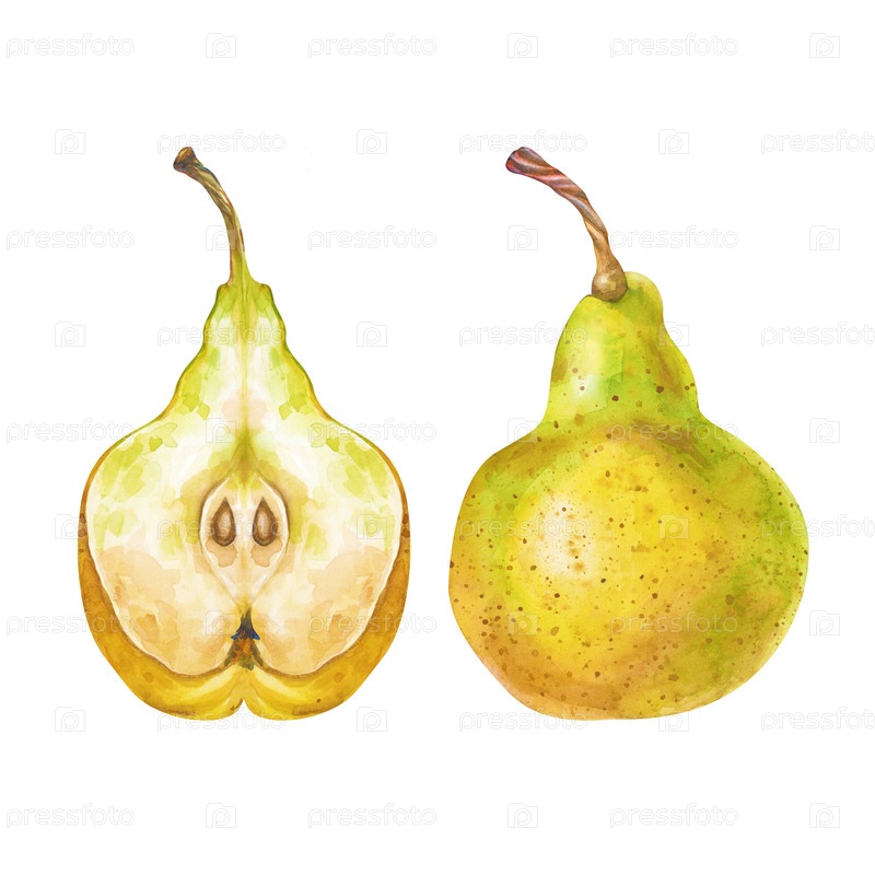 Две груши, целые и наполовину с семенами, на изолированном фоне. акварельная реалистичная иллюстрация. клипарт со зрелыми желтыми плодами для дизайна продуктовых линий и фермерских тем с уборкой урожая