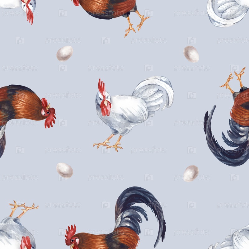 Бесшовный рисунок с петухами и яйцами на сером фоне. акварельный фон с белыми и коричневыми петухами в натуральных цветах. реалистичный повторяющийся фон для дизайна сельскохозяйственной продукции и сельского хозяйства