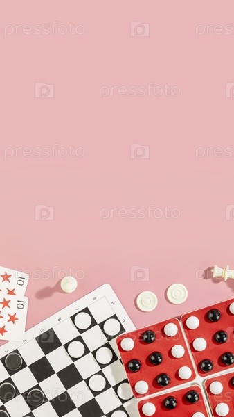 Игры на доске Flat Lay с шашками, домино и игральными картами на розовом фоне