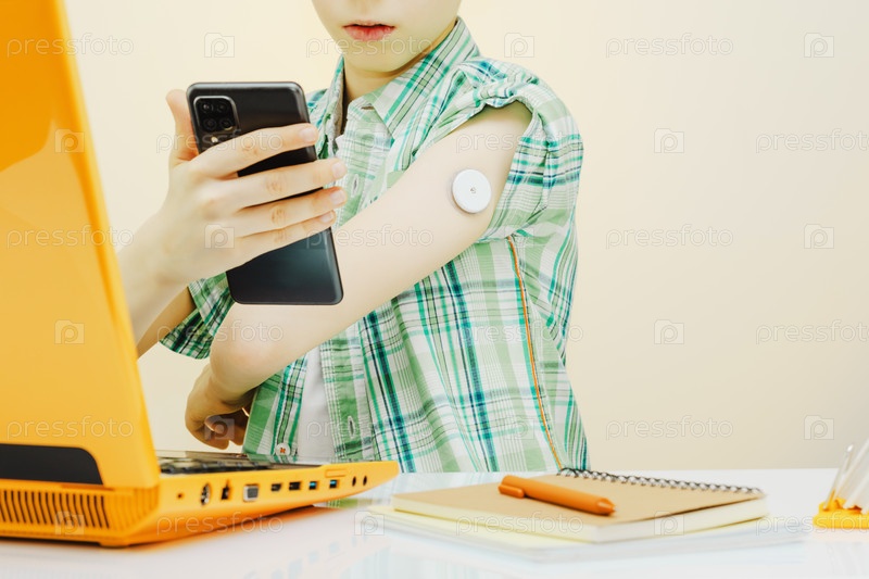 Подросток с непрерывным монитором глюкозы проверяет смартфон на рабочем столе