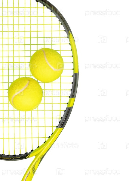 Изолированная теннисная ракетка с двумя ярко-желтыми шарами на прозрачном фоне