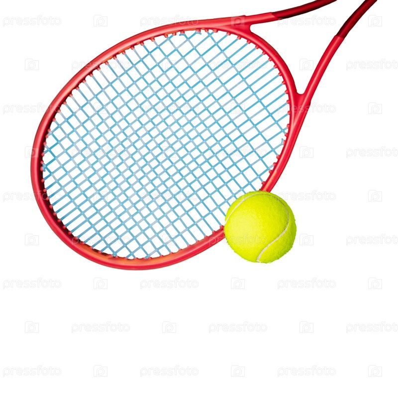 Изолированная, красная теннисная ракетка с желтым теннисным мячом на прозрачном фоне