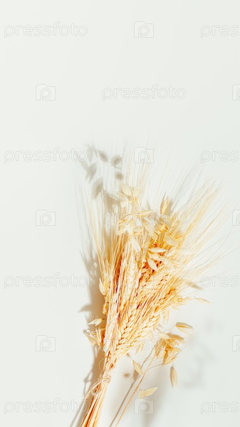 Золотые пшеничные уши с мягкой тенью на светлом фоне с копировальным пространством