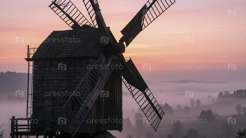 Спокойный рассвет на деревянной ветряной мельнице
