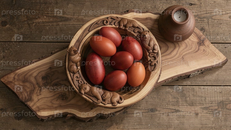 Деревянная чаша с красными яйцами для празднования Пасхи
