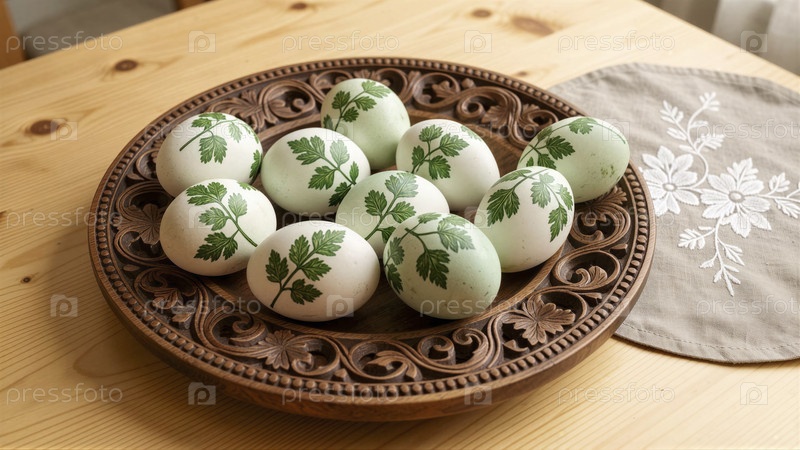 Пасхальные декоративные яйца с зелеными узорами листьев