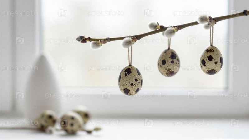 Праздничные пасхальные украшения с перепелиными яйцами и ветвями ивы