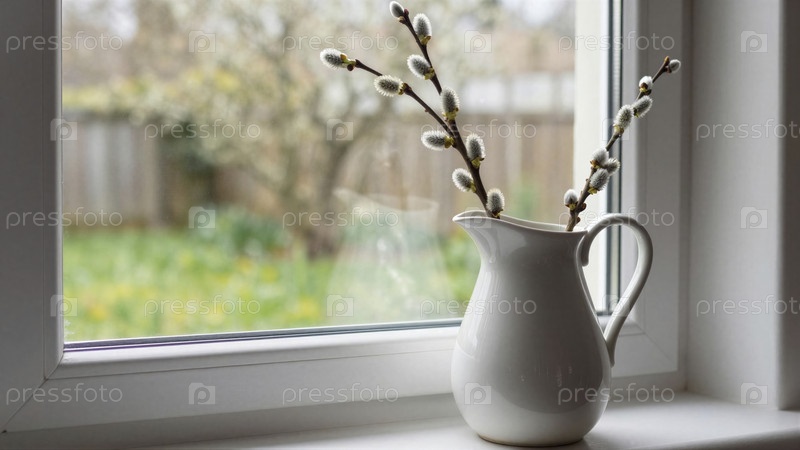 Ведра пасхальной ивы в керамическом кувшине у окна
