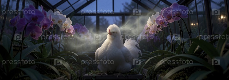 Спокойная теплица с белыми голубями и цветущими орхидеями