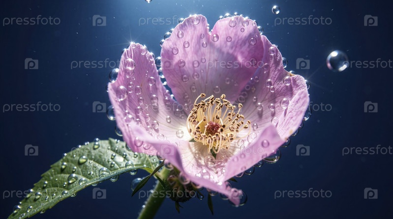 Розовый цветок, покрытый росой в мягком сумеречном свете