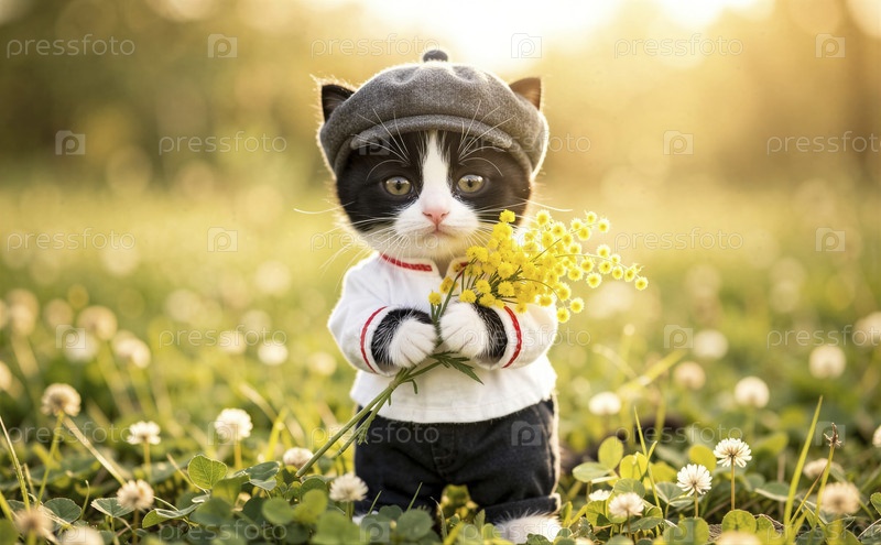 Очаровательный котенок в берете с желтыми цветами