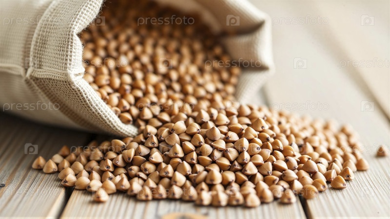 Семена гречихи разливаются из мешка на деревянной поверхности