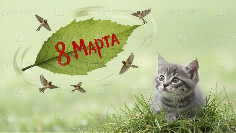 8 марта отмечается Международный женский день со сладкой кошкой и птицами
