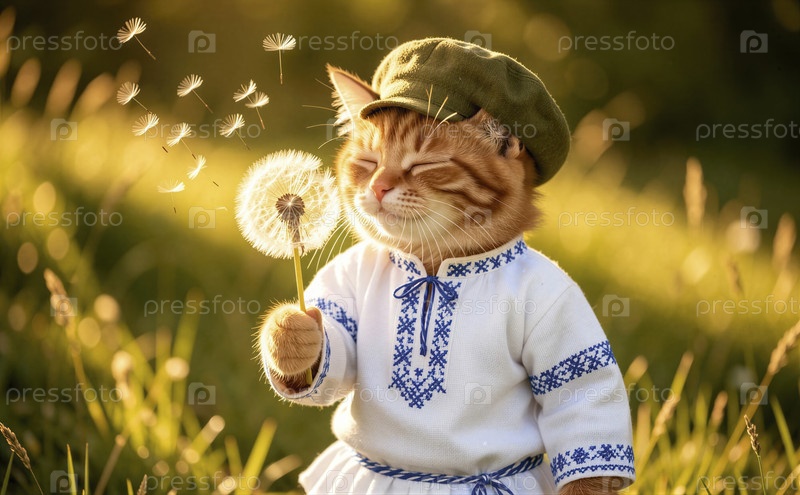 Причудливый кот в берете, дующий семена лепешки