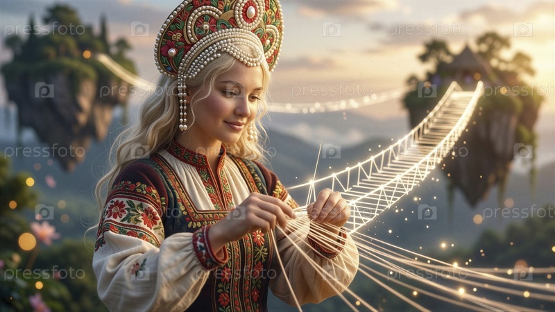 Женщина в традиционной одежде вяжет с эфирными плавающими островами на заднем плане