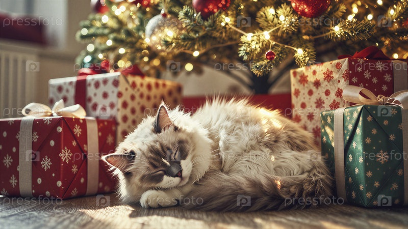 Праздничная кошка под рождественской елкой