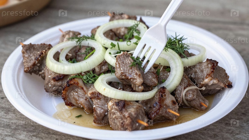 Горячие говяжьи кебабы с луковыми кольцами и травами